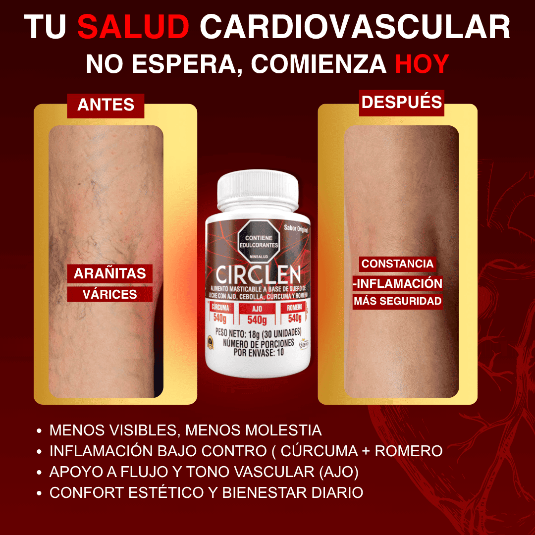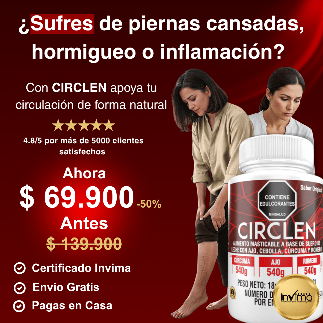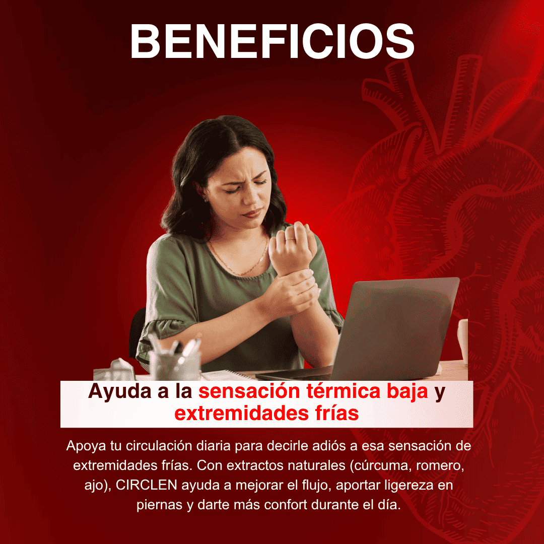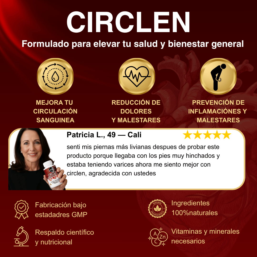 CIRCLEN es un suplemento alimenticio formulado para acompañar el bienestar circulatorio. Muchas clientas lo usan como apoyo cuando sienten pesadez en piernas, hinchazón, hormigueo/entumecimiento por estar mucho tiempo de pie o sentadas, y para el confort articular del día a día. No es un medicamento.