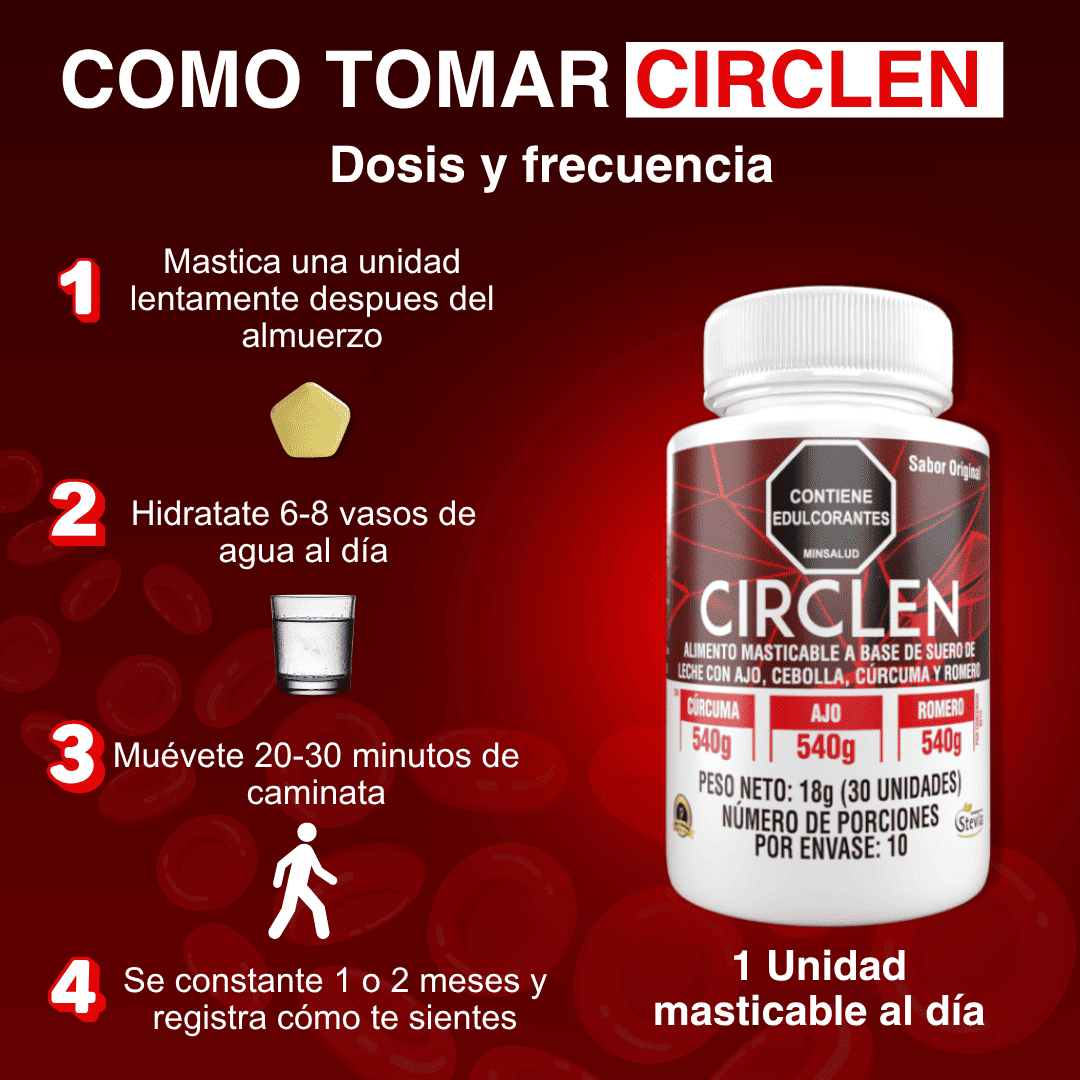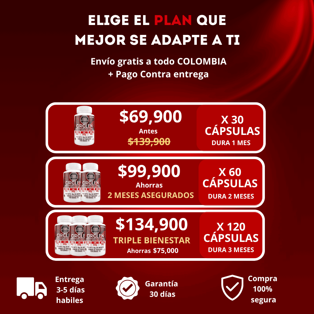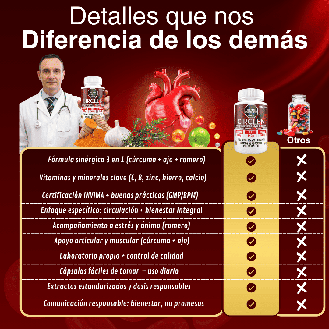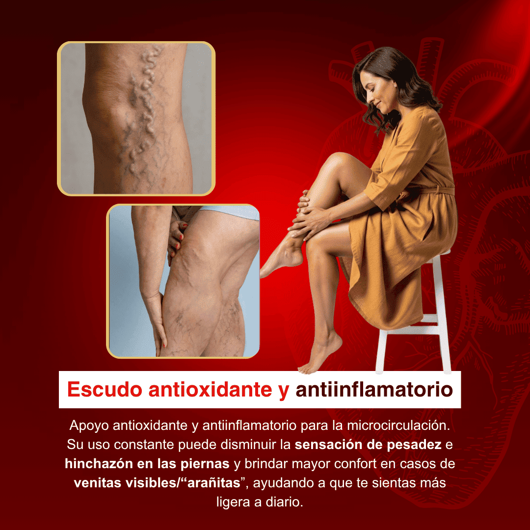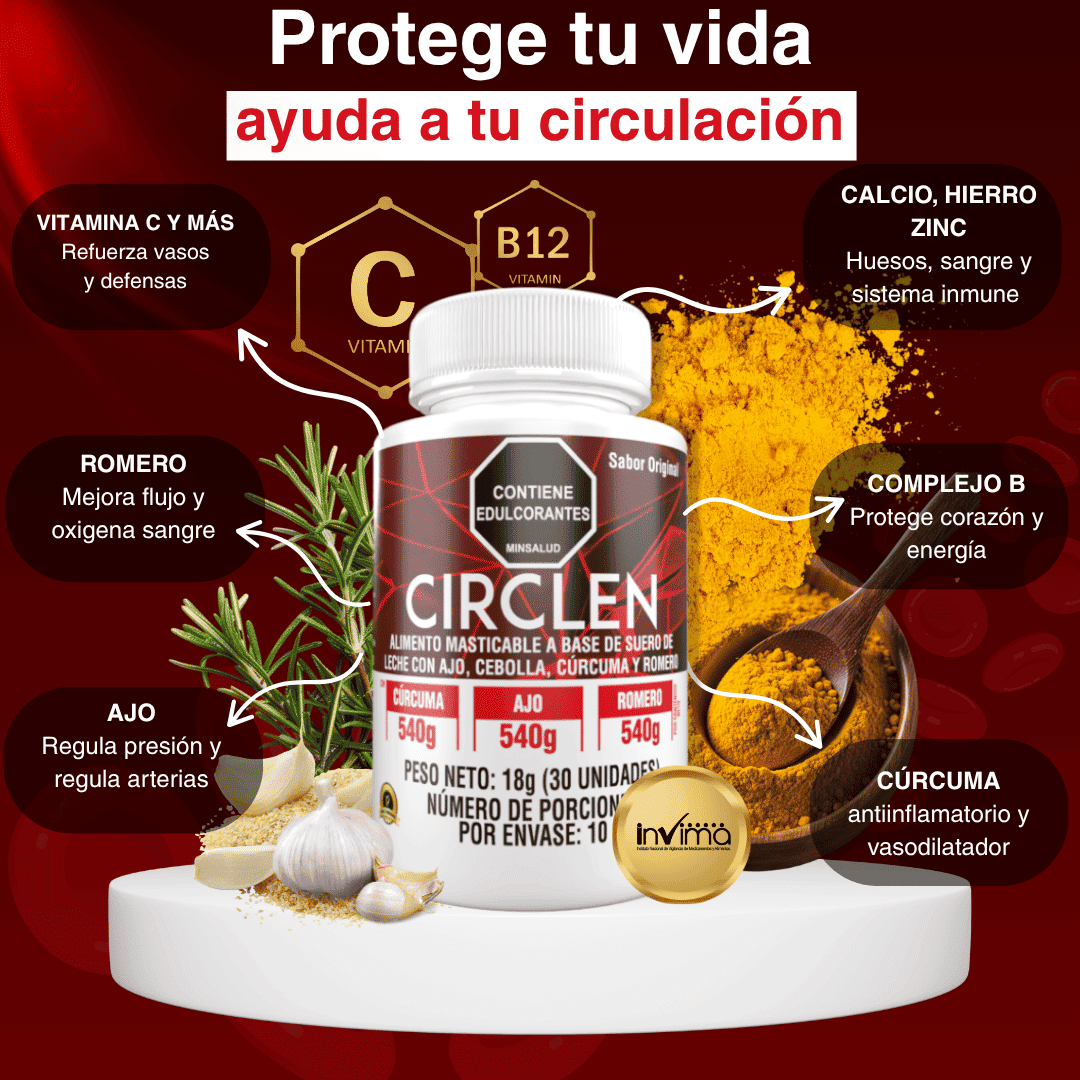 CIRCLEN es un suplemento alimenticio formulado para acompañar el bienestar circulatorio. Muchas clientas lo usan como apoyo cuando sienten pesadez en piernas, hinchazón, hormigueo/entumecimiento por estar mucho tiempo de pie o sentadas, y para el confort articular del día a día. No es un medicamento.